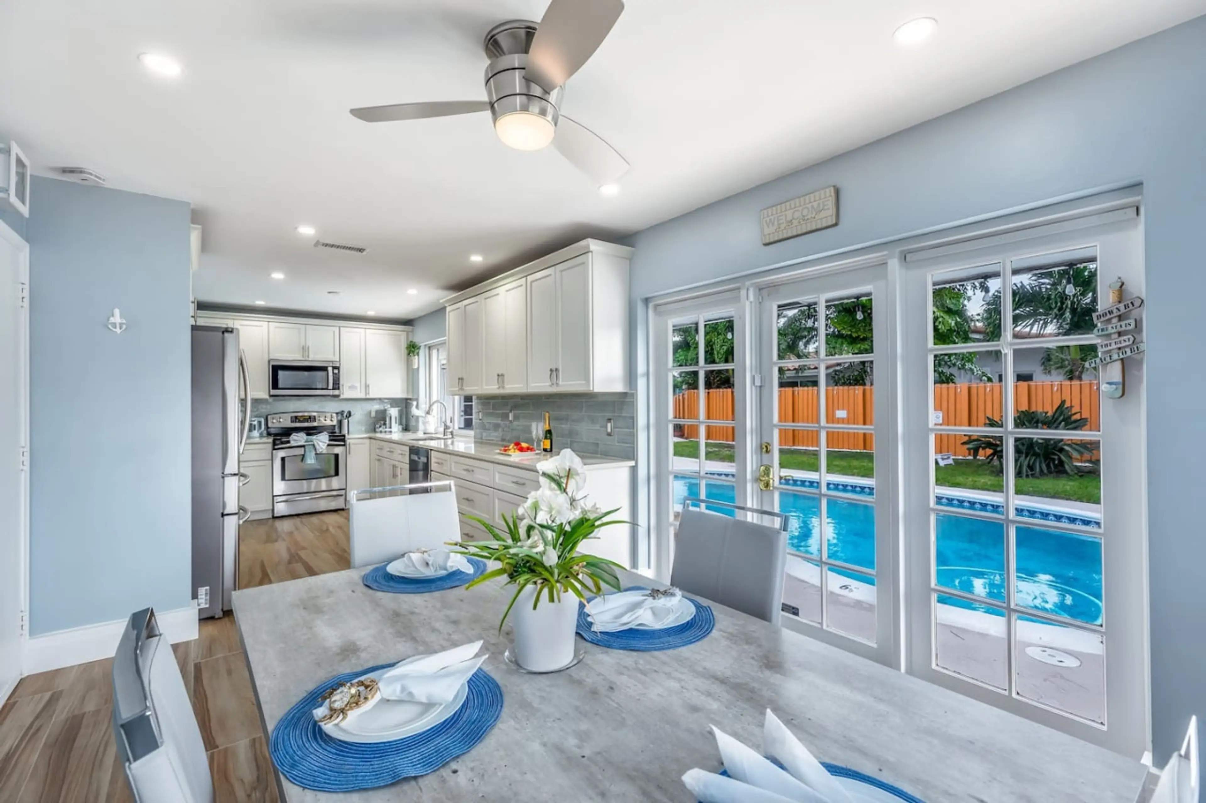 Dream vacation in a Tropical Paradise near beautiful beaches, restaurants, shopping and amenities. Unwind in a modern, quiet, safe, family-friendly neighborhood. Heated pool, fun games, fire pit, picnic table, BBQ grill, Tiki umbrella, dock and a private sandy beach. Enjoy a romantic candlelight din...